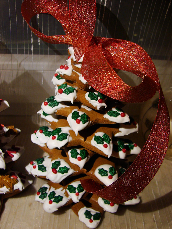 Inna metoda na zrobienie trójwymiarowej choinki z piernika. Wycinamy z piernikowego ciasta cztery połówki choinki, po upieczeniu sklejamy je brzegami za pomocą lukru. Na górze przyklejamy małą piernikową gwiazdkę i zdobimy całość wedle uznania.